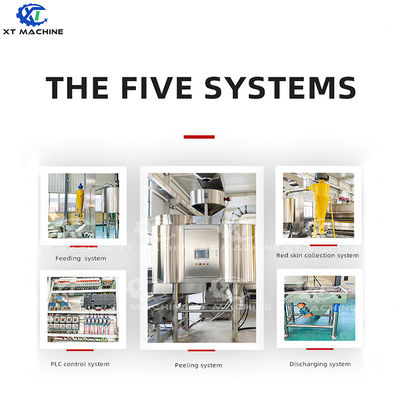 La chambre de blanchiment des cacahuètes adopte une structure de cavité spéciale, et l'hôte de blanchiment souffle et libère automatiquement selon les instructions du programme pour terminer le processus de blanchiment. La surface des cacahuètes après blanchiment n'est pas endommagée, le taux d'épluchage est aussi élevé que 98 %, et le taux de blanchiment global des cacahuètes est aussi élevé que 85 %.